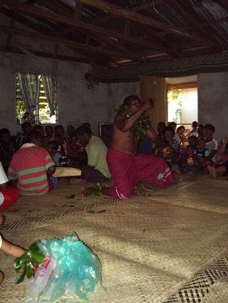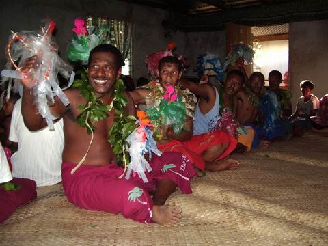 The "fans" that the guys are using in their dance are decorated with pieces of bright yarn and strips of plastic bags of various colors. How's that for recycling!?