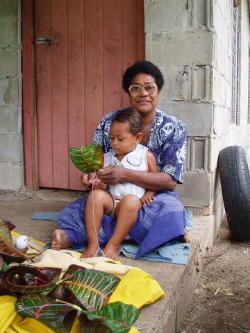 This is Losana. She is sewing leaves to make an ornamental belt for her daughter's dancing costume.